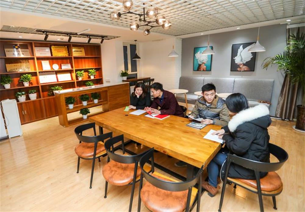 在4樓眾創(chuàng)空間,聚集著50多家在孵跨境電商企業(yè),多數(shù)都是90后創(chuàng)業(yè)人員。25日臨近傍晚6點,不少創(chuàng)客仍埋頭忙碌。在眾創(chuàng)空間打造的咖啡吧,幾個年輕人正探討業(yè)務。